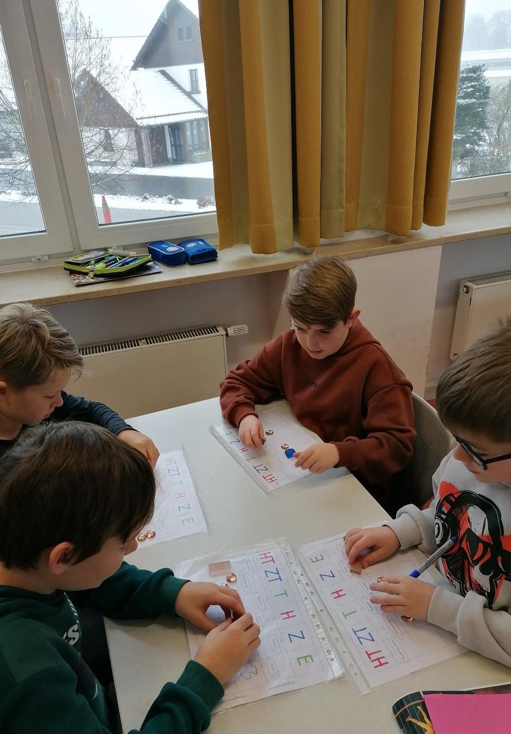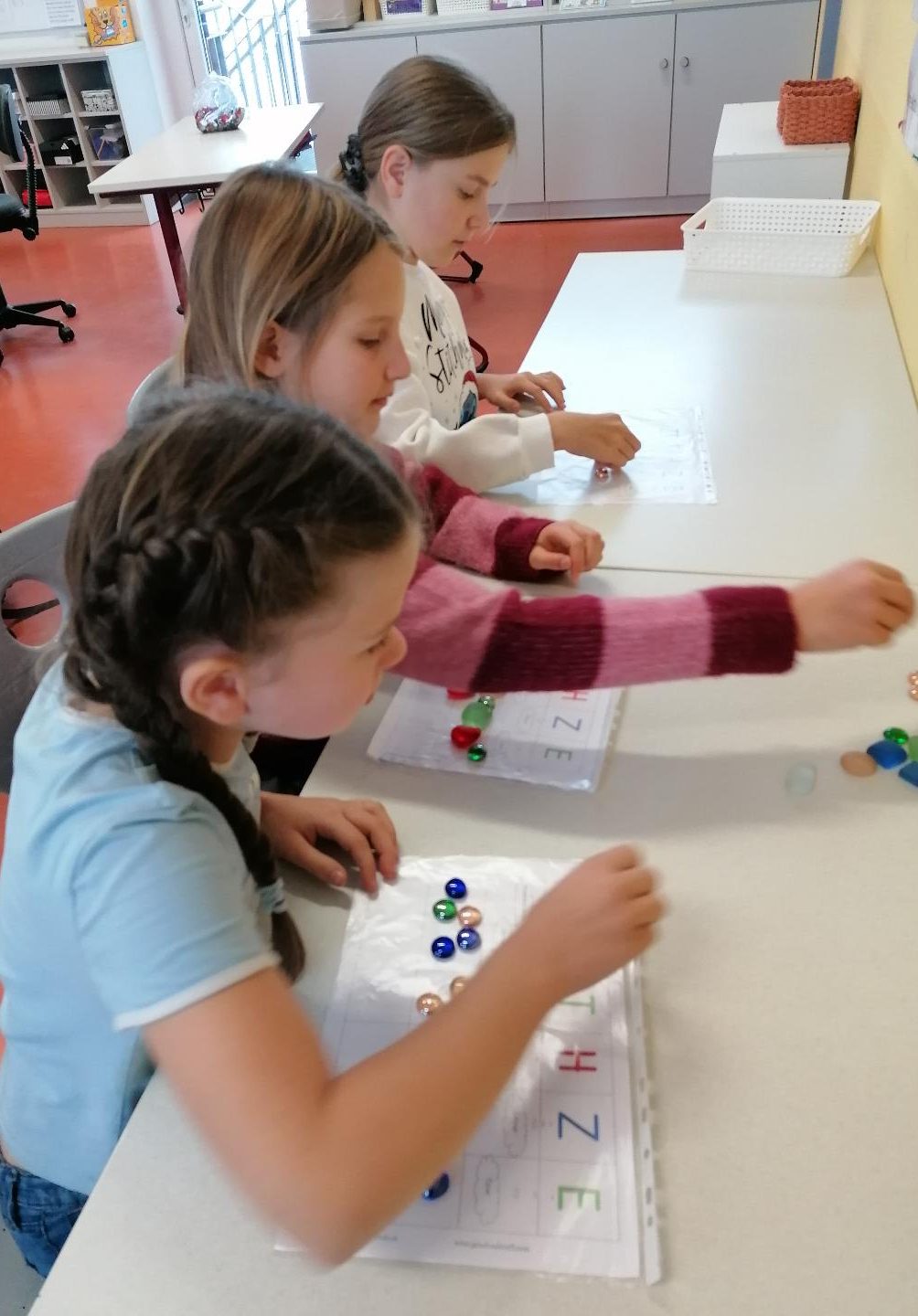 Mit Hilfe einer Stellenwerttafel und farbigen Muggelsteinen machten die Kinder grundlegende Zahlbegriffe sichtbar und begreifbar. Jede Stelle – Tausender, Hunderter, Zehner und Einer – wurde durch passende Steine belegt. Die Kinder legten verschiedene Zahlen, tauschten Steine aus und erklärten einander, welche Zahl sie dargestellt hatten. So wurde nicht nur das Verständnis für Stellenwerte gestärkt, sondern auch die korrekte Benennung großer Zahlen weiter geübt.
